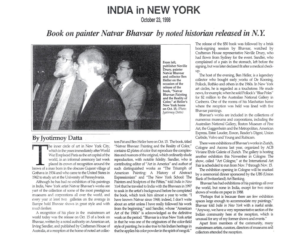 "A recognition of [Bhavsar's] place in the mainstream art world today was the release on Oct. 15 of a book on Bhavsar, written by a noted authority on American art, irving Sandler, and published by Craftsman House of Australia, at a reception at the home of noted art collectors Pat and Ben Heller, ...titled "Natvar Bhavsar: Painting and the Reality of Color," contain[ing] 42 plates of color that reproduce the complexities and nuances of the original, which ordinarily elude reproduction, with notable fidelity."