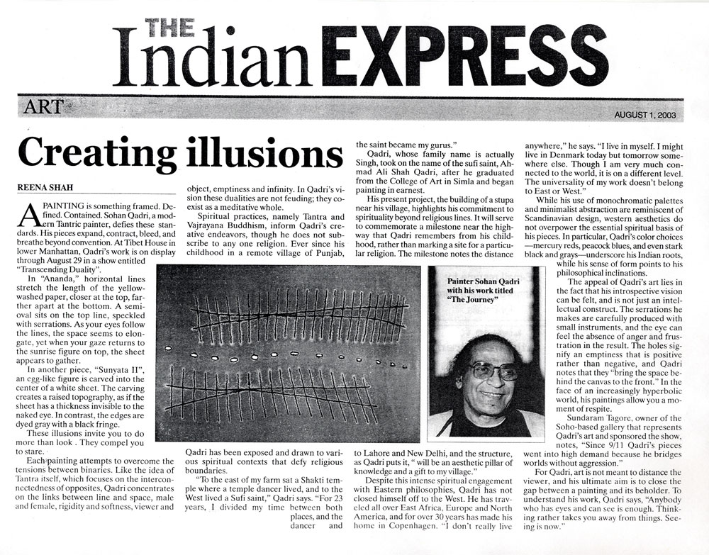 "Sundaram's current passion is the work of a man of mystery. He is the Copenhagen-based painter cum tantrik, Sohan Qadri, who will have a one-man exhibition at the Sundaram Tagore Gallery starting on September 5."