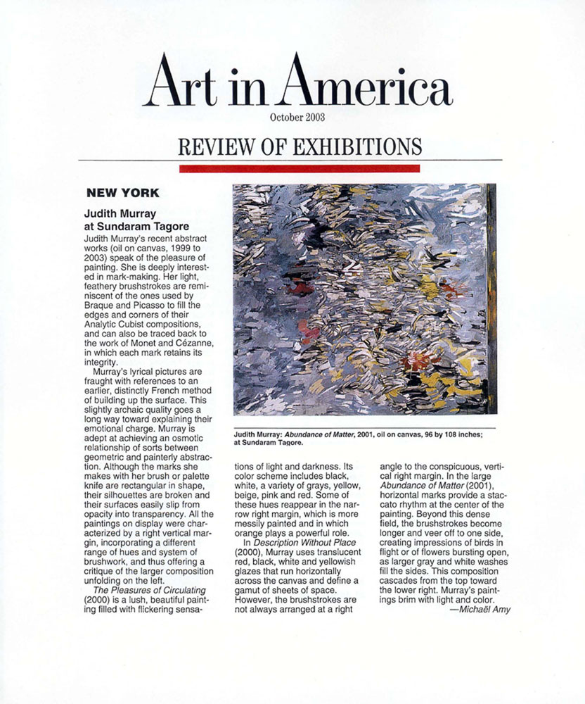 "Murray's lyrical pictures are fraught with references to an earlier, distinctly French method of building up the surface. This . . . goes a long way toward explaining their emotional charge."
