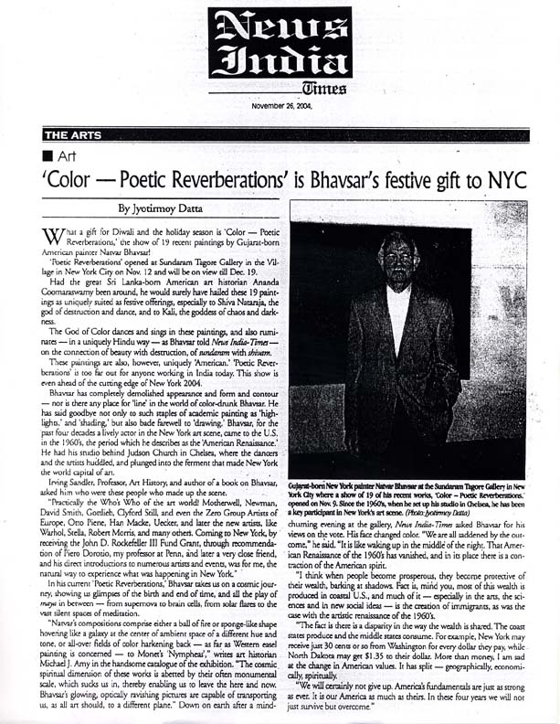 "...The two things that stand out about Bhavsar's works are the colors and the sizes, both bold and magnificent. While critics noticed similarities between the size of his works and those of Jackson Pollack, Mark Rothco and Barnett Newman, none of these art greats were able to capture the color he was exposed to in his youth in India..."