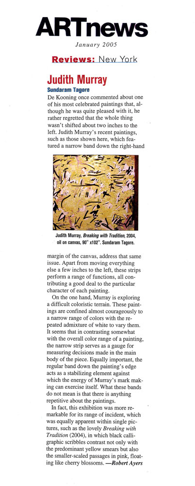 "...What was most alluring about the recent works was the way Murray built up their surfaces to convey depth and motion. Her dexterity with paint seems to have released her creative energy and pinned it to the canvas..."