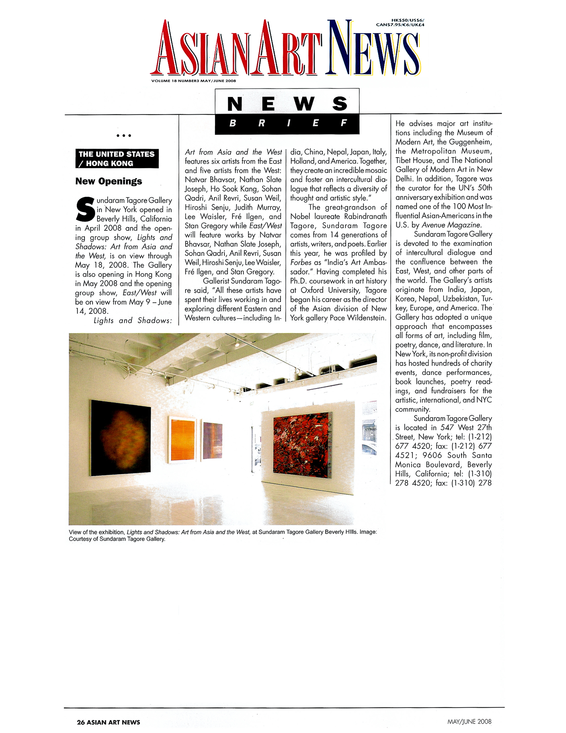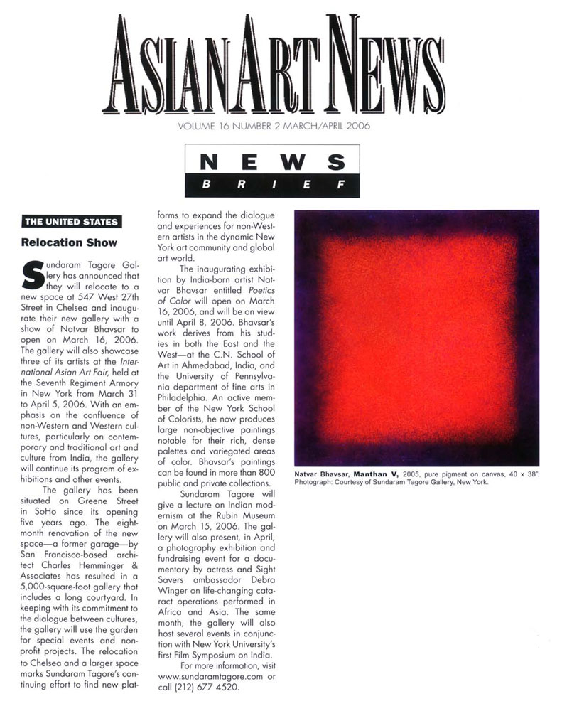 "Sundaram Tagore Gallery has announced that they will relocate to a new space at 547 West 27th Street in Chelsea and inaugurate their new gallery with a show of Natvar Bhavsar to open on March 16, 2006."