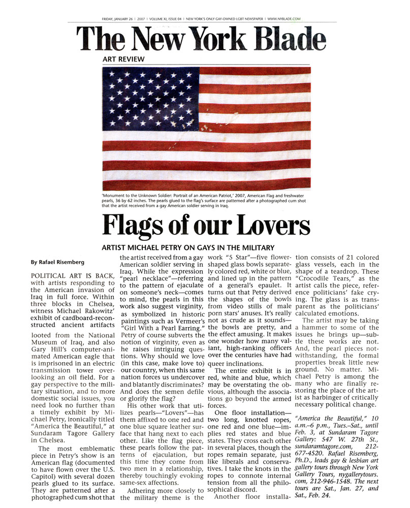 "Political art is back, with artists responding to the American invasion of Iraq in full force . . . [Petry] raises intriguing questions. Why should we love our country when this nation forces us undercover and blatantly discriminates?"