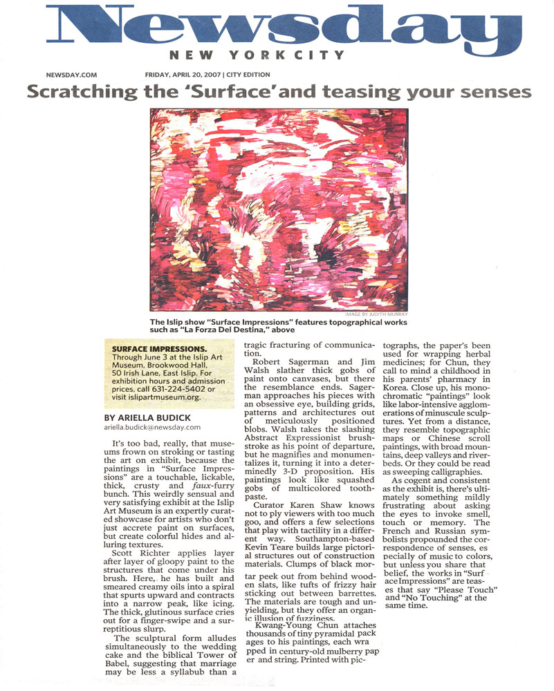 "The Islip show 'Surface Impressions' features topographical works such as La Forza Del Destina "