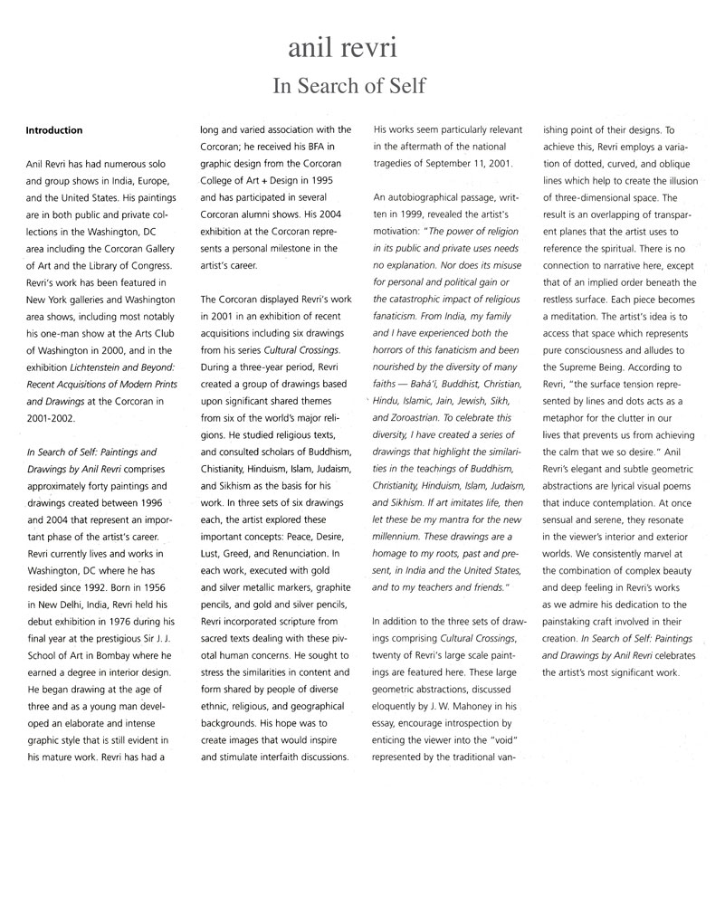 "...Bhavsar's paintings are not limited to their surface colors - which are indefinable, suffused as they are with additional tones such as violet, saffron, rose, vermillion, cinnamon, midnight blue, and emerald, tinged warm and cool. Thier surfaces can resemble smoke when the hues evanesce, or they can be more tangible, pebbled textures and raised patterns, edged in a flame motif..."
